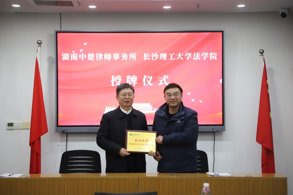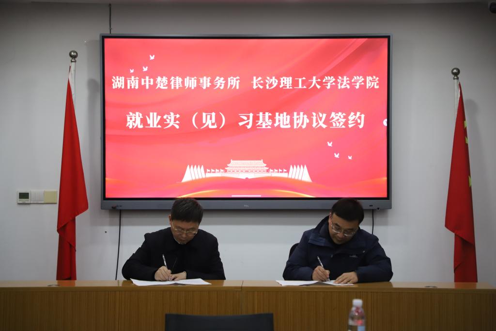 随后,吴勇、杨建明代表学院和事务所签署就业实(见)习基地合作协议,随后举行了简单而隆重的授牌仪式,标志着长沙理工大学法学院与湖南中楚律师事务所的合作正式落地。