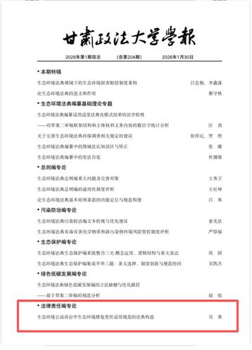 近日,长沙理工大学法学院吴勇教授在法学类CSSCI(扩展版)《甘肃政法大学学报》2026年第1期发表论文《生态环境公益诉讼中生态环境修复责任适用规范的法典构造》,该文系湖南省社会科学成果评审委员会重大项目“环境犯罪轻罪治理机制研究”(XSP25ZDA004)的阶段性成果。