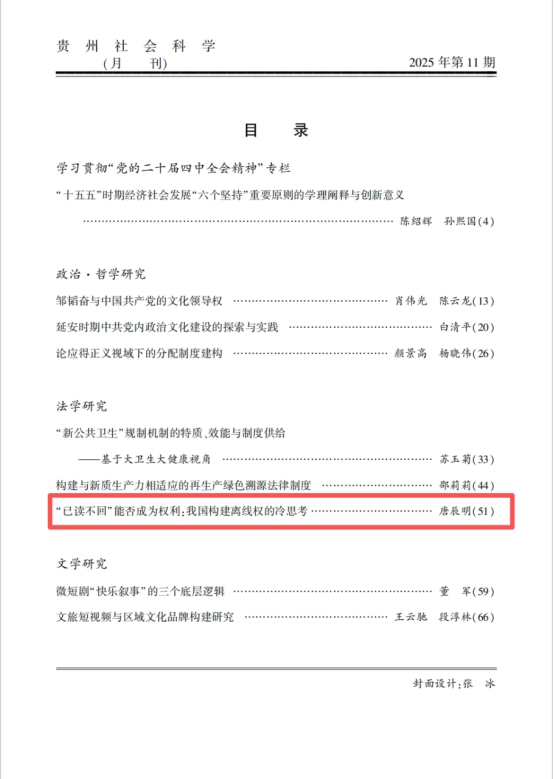 近日,长沙理工大学法学院讲师唐辰明在《贵州社会科学》2025年第11期发表论文《“已读不回”能否成为权利:我国构建离线权的冷思考》。