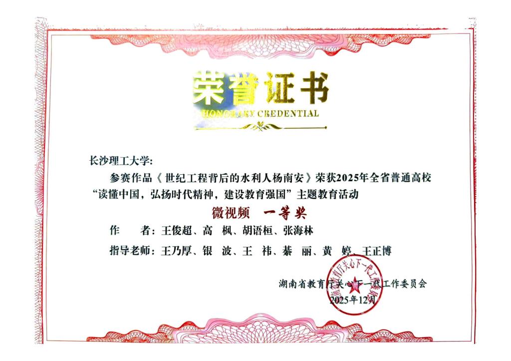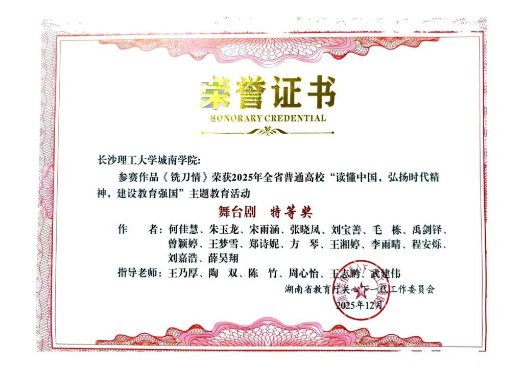 省委教育工委于12月上旬下发《关于公布2025年全省普通高校“读懂中国”主题教育活动优秀组织奖和作品奖评审结果的通知》,我校报送的舞台剧《铣刀情》荣获教育部关工委舞台剧优秀奖、省教育厅关工委舞台剧特等奖,征文《弹痕里的赤子勋章》荣获教育厅关工委征文一等奖,微视频《世纪工程背后的水利人杨南安》荣获省教育厅关工委微视频一等奖。我校获评省教育厅关工委优秀组织奖,城南学院获评教育部关工委和省教育厅关工委优秀组织奖。