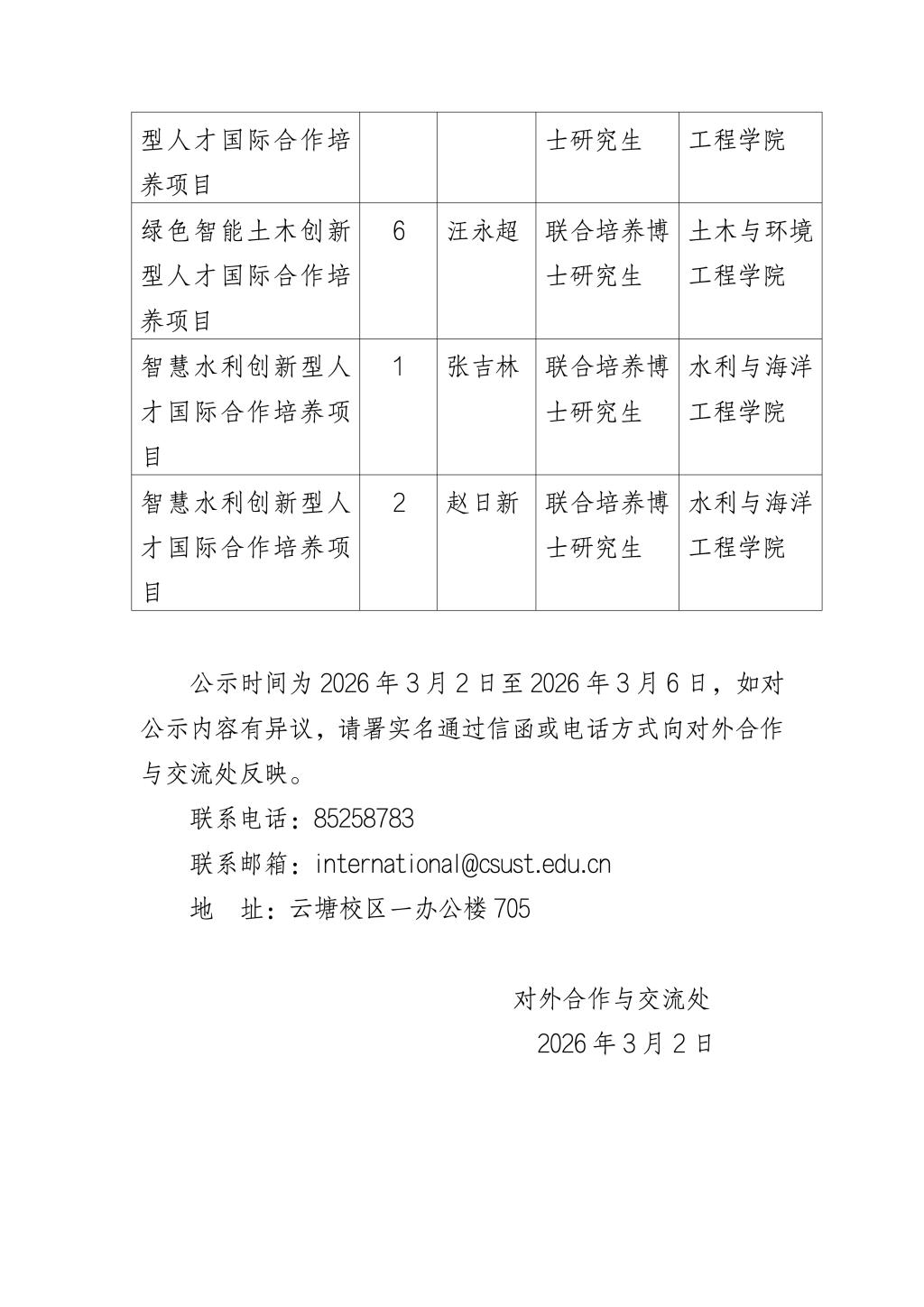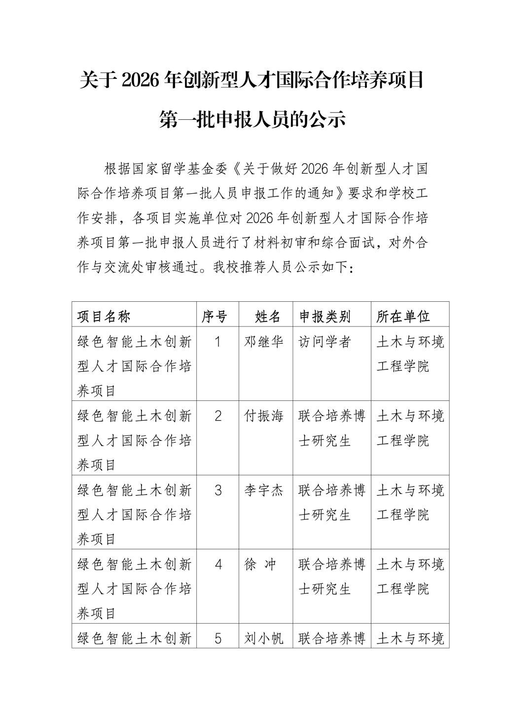关于2026年创新型人才国际合作培养项目第一批申报人员的公示