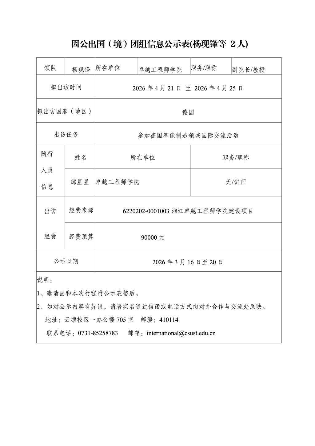 因公出国(境)团组信息公示表(杨现锋等2人)