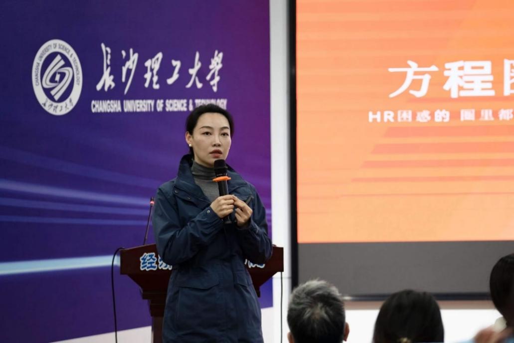 然后,湖南六识文化产业发展有限公司总经理廖芮做了题为“方程圈-一站式助力大学生实习就业”的演讲。廖总经理从大学生就业难的社会问题、大学生就业的痛点、社会各方的实施助力措施等方面进行阐述,尤其以六识文化企业以方程圈在线平台为例,提出有效解决大学生实习就业实施方案及模式。进而以六识文化企业积累的企业实操性专业化课程、常态化活动等方式融入大学生群体,了解大学生实习就业的困惑,并借助方程圈平台为大学生提升自身素质能力提供助力。
