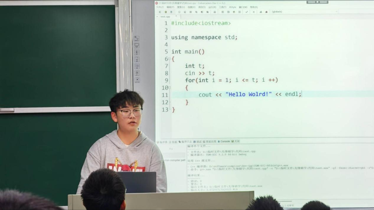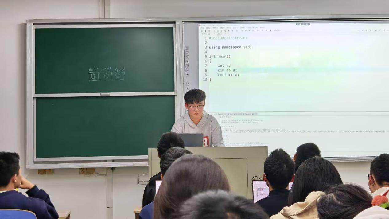 钱昱丞结合自身扎实的专业基础与丰富的学习经验,设计了循序渐进的三阶授课体系。课堂伊始,他为同学们详细介绍了多款主流在线练题平台的功能特点与使用技巧,帮助大家快速熟悉编程练习环境,搭建高效学习工具矩阵。随后,他以清晰易懂的逻辑、生动形象的表达,系统拆解 C++ 语言的基础语法与核心概念,针对性解答初学者常见困惑,有效化解了大家对编程学习的畏难情绪。在实战演练环节,他精选典型例题,现场开展代码剖析与分步演示,重点标注语法陷阱与常见错误,通过 “理论 + 实践” 的教学模式,切实强化了同学们的代码应用能力与问题解决能力。
