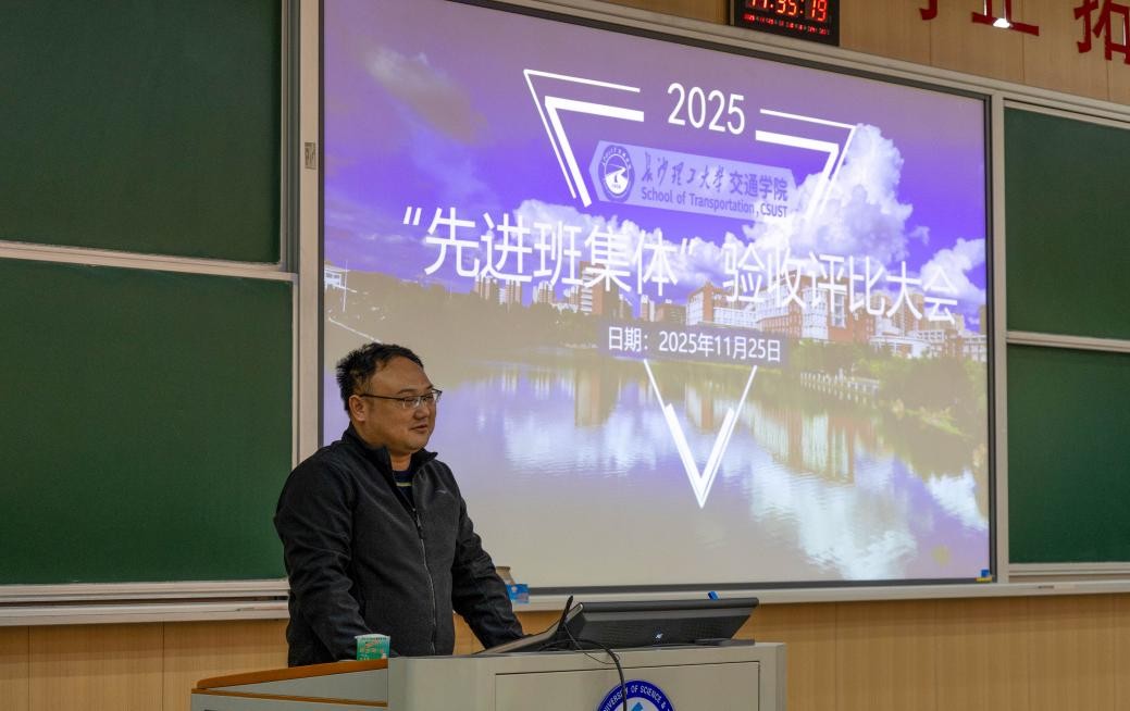 11月25日14:30,交通学院于云塘校区综合教学楼B102召开2025年“先进班集体”验收评比大会。本次会议由院团学办公室干事谭语琪主持,交通学院党委副书记任志祥、学工办辅导员聂静老师出席并担任评委。交通学院第十九届团委、学生会委员、院属各班班长、团支书及答辩班级的亲友团,共计100余人与会。