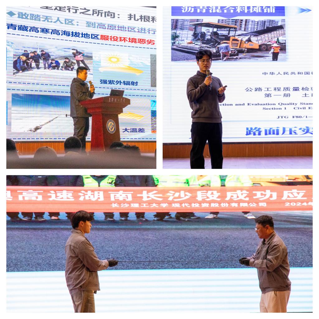 随后,“大道行远”理论宣讲团从科研攻关、技术创新和公益实践三个维度分享成长经验。全国博士后创新创业大赛金奖获得者夏诚东讲述团队耗时六年攻克高原公路建设难题,自主研发高性能沥青材料助力青藏高原交通建设的奋斗历程;湖南省职业规划大赛一等奖获得者琚子豪介绍了自己立志做高寒、高海拔地区的道路守护者的决心与规划;创业典型、长沙皓途交通科技有限公司法人王成博讲述了团队首创路面压实智能检测机器人服务行业前沿、服务超级工程、服务极端环境的双创之路,2025年暑期“三下乡”社会实践重点团队“冰峰筑路”社会实践团、“交通筑梦”实践团负责人史丽雯、沈雅丽分享了各自团队依托专业、深耕实践、服务社会的实践旅程。