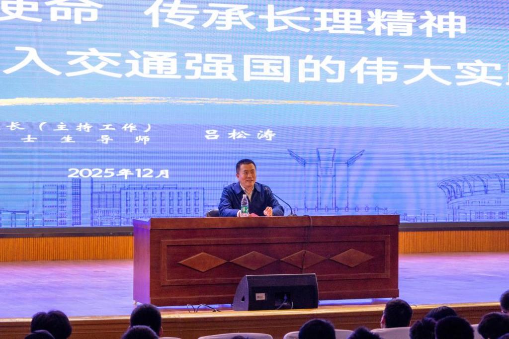 课上,吕松涛教授以《牢记强国使命,传承长理精神,将青春热血融入交通强国的伟大实践》为题,深刻剖析了交通强国内涵与战略地位,系统回顾新中国成立以来交通运输事业取得的历史性成就,着重介绍了长沙理工大学三代交通人开拓、创新、引领的四十载征途,勉励全体新生坚定理想信念、筑牢精神之基,练就过硬本领、夯实成才之基,勇于担当作为、践行报国之志。