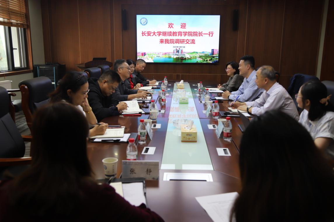 2025年10月15日上午,长安大学继续教育学院院长涂帅一行来我院调研交流。双方在15教四楼会议室进行了座谈交流。长沙理工大学继续教育学院院长邹兴平,副院长郑咏梅、谢朝华以及党政办公室、自考、培训等相关部门主任参加座谈。