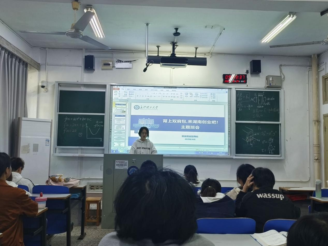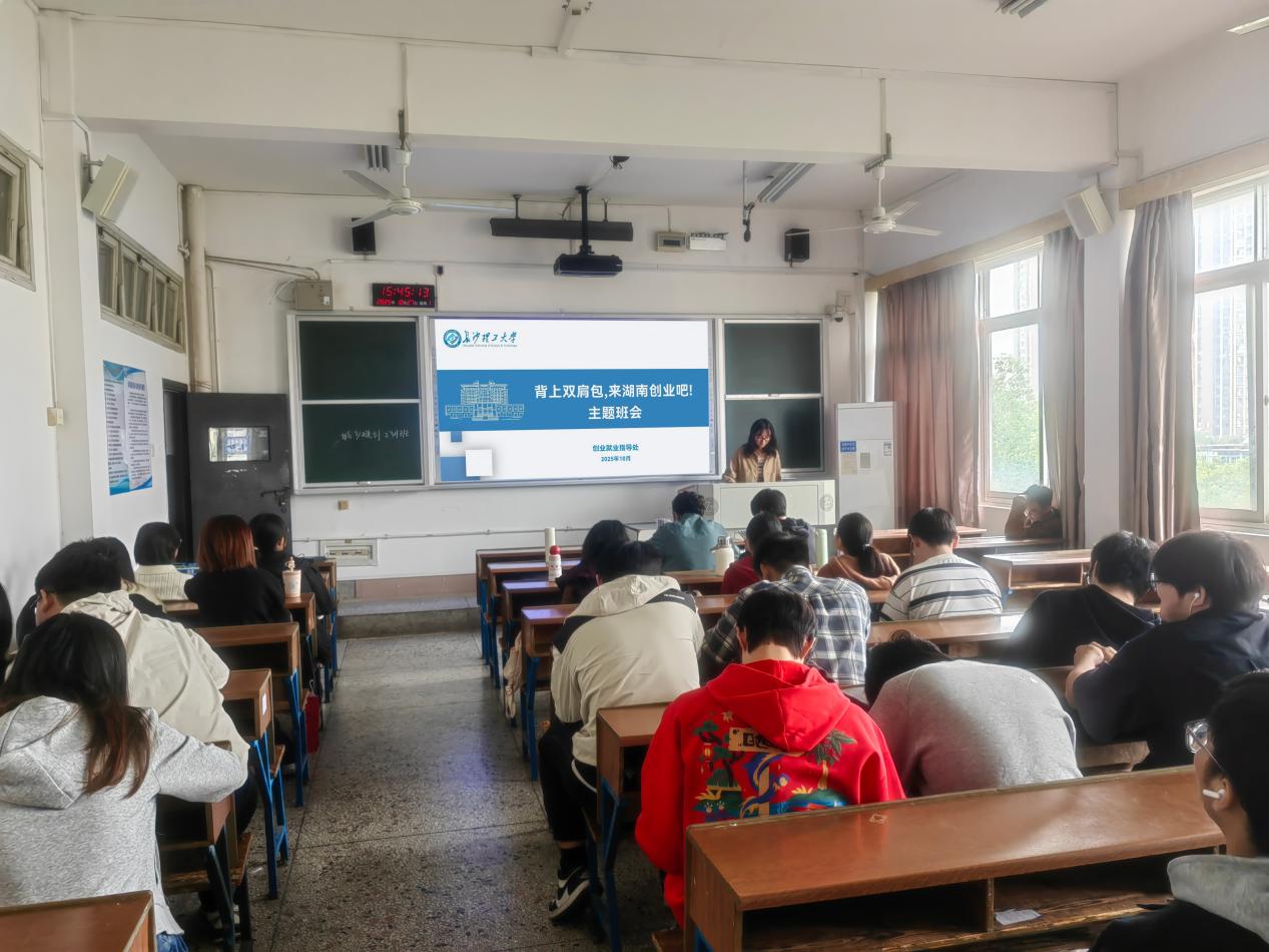 为深入贯彻湖南省《支持大学生创业若干措施》通知精神,帮助学生全面了解创业扶持政策,激发创新创业热情。近期长沙理工大学建筑学院召开“背上双肩包,来湖南创业吧!”主题班会,主题班会覆盖全院全体学生