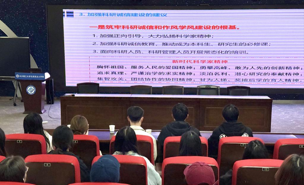 为引导学生厚植科研情怀、坚守学术诚信,2025年10月22日下午,长沙理工大学马克思主义学院在云塘校区文科楼B300报告厅组织2025级研究生观看由湖南省科技厅和教育厅共同组织开展的“弘扬科学家精神,系好学术生涯‘第一粒扣子’”专题宣讲活动直播。