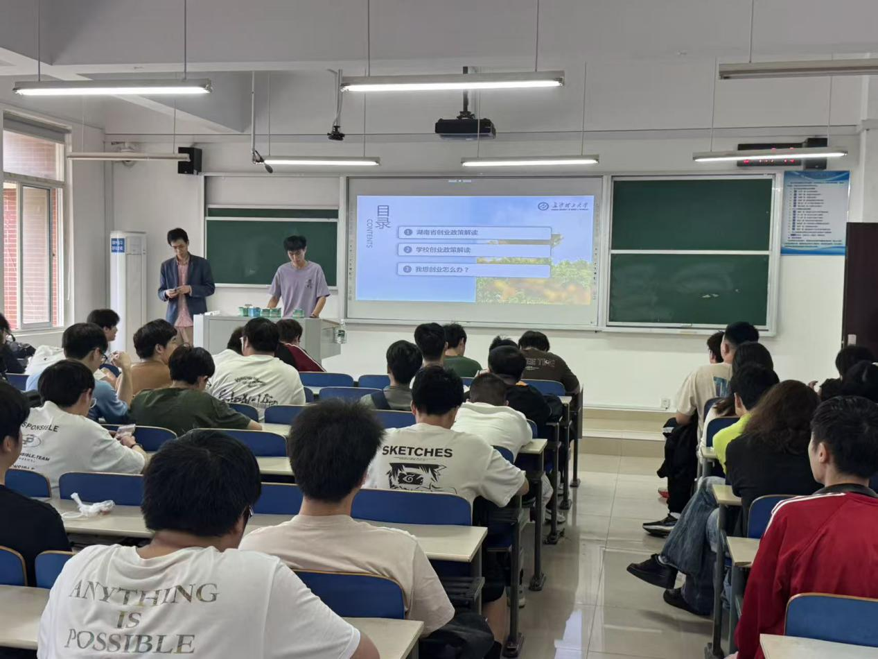 创业教育面向全体学生,系统解读湖南省“七个一”创业政策及学分认定、毕业设计、休学创业、评优推免等利好措施,详细介绍学校推免加分、弹性学制、奖金扶持、学分转换等全流程支持体系。班会鼓励能动学子在新能源、节能环保等新技术、新业态领域探索。