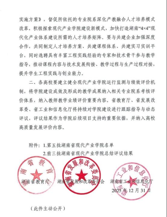近日,湖南省教育厅公布第五批现代产业学院立项建设名单,我校申报的智能技术与装备现代产业学院成功获批。这是学校深化产教融合、服务区域发展的重要成果,标志着学院在新工科建设与产业协同育人方面迈上新台阶。