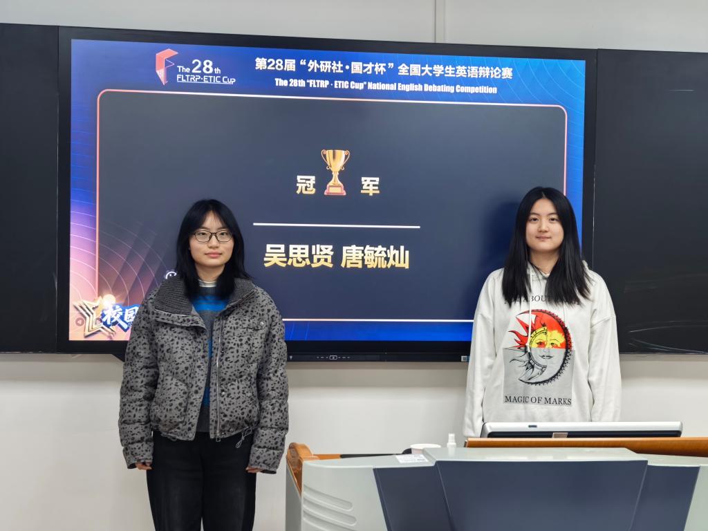 本次比赛自启动以来,吸引了来自全校各学院众多英语爱好者的踊跃参与,共计60余支队伍提交了参赛视频。经过首轮海选,共有16支队伍晋级复赛。经过现场复赛、半决赛及决赛的层层选拔,来自我校外国语学院的吴思贤同学与唐毓灿同学凭借扎实的语言功底、严谨的逻辑思辨能力以及默契的临场配合,在激烈的角逐中脱颖而出,成功斩获校园选拔赛冠军,并将代表我校参加接下来的华南大区赛。具体获奖名单详见附件。