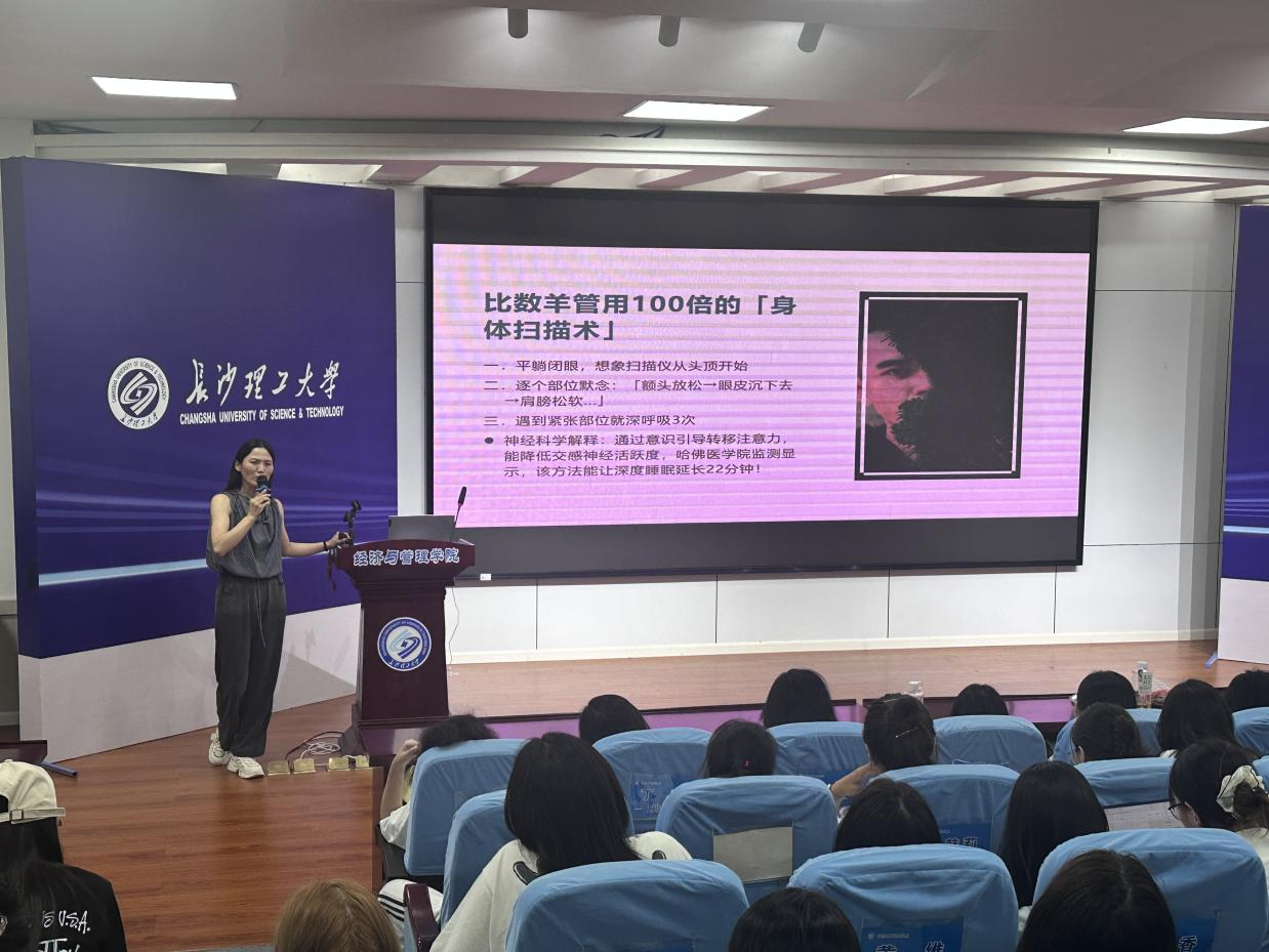 在讲座的最后环节,陈金虹还分享了多种改善睡眠质量的方法,包括睡前90分钟的“黄金升温法”、身体扫描技术以及助眠放松操。现场同学积极参与互动,跟随指导进行体验学习。