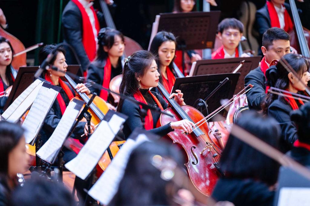 音乐会的曲目编排兼具经典底蕴与艺术新意,十二首曲目涵盖交响乐、声乐独唱、民歌改编等多种形式。《节日序曲》率先奏响,肖斯塔科维奇的经典旋律以恢弘的气势拉开演出帷幕;《春之声圆舞曲》《蓝色多瑙河》《雷电波尔卡》等小约翰·施特劳斯的代表作接踵而至,明快的节奏与优美的旋律勾勒出春日的生机与节日的欢腾,让现场观众沉浸式感受维也纳圆舞曲的独特魅力。西洋经典声乐作品的演绎同样亮眼,黎明的嗓音高亢嘹亮,将《我的太阳》这首经典那不勒斯民歌的情感表达得淋漓尽致;《歌剧魅影组曲》重现音乐剧的经典旋律,氛围感拉满;男声独唱《斗牛士之歌》,则将歌剧《卡门》中的豪迈气概展现得酣畅淋漓。民族与时代之声也在音乐会中绽放光彩,改编自江苏民歌的《茉莉花》婉转悠扬,尽显东方音乐的温婉之美;戴韩安妮带来女声独唱组曲,《但愿人长久》《Hero》《凤凰花开的路口》三首曲目使古典诗词的意境、英文金曲的力量与校园情怀的温暖交织,引发观众情感共鸣。此外,《百叶窗》的轻柔旋律、《我爱你中国》中炽热的家国情怀、压轴曲目《领航》里昂扬的时代精神,都将现场氛围一次次推向高潮。