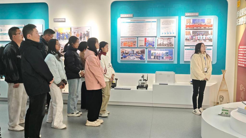 在创新创业园,同学们在讲解员的引导下,全方位了解了学校创新创业教育的建设成果。展厅内陈列的学生创新作品、专利证书、竞赛奖杯以及扎根行业的创业案例,生动呈现了从创意萌芽到成果落地的全过程。在一件件实物展品前,同学们驻足交流,切身感受到创新实践的蓬勃力量与现实价值。