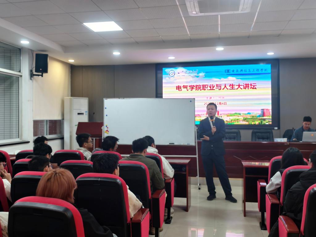 12月4日下午,电气与信息工程学院“职业与人生大讲坛”在学院报告厅举行。活动特邀2007级校友、国网山东超高压公司党委党建部主任兼工会副主席付兴担任主讲嘉宾,围绕职业生涯规划与人生成长开展专题分享。现场座无虚席,学生们聆听校友经验,共话成长路径。