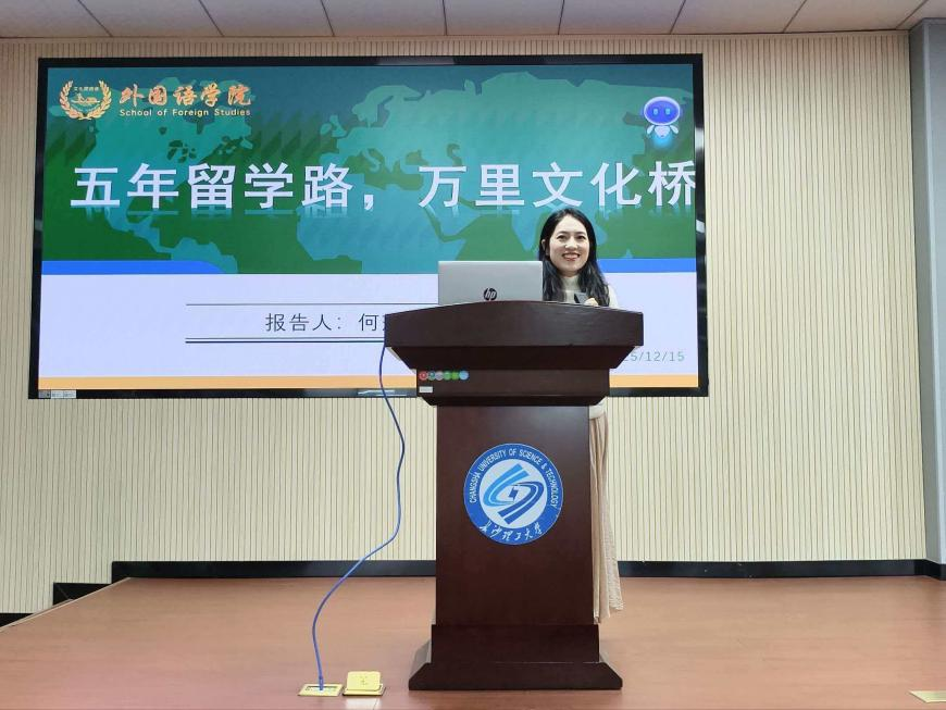 为帮助学生拓宽国际视野,深入了解西语世界文化,外国语学院“文化摆渡大讲堂”西语主题讲座于12月15日晚在金盆岭校区三号教学楼举行。本次活动由语言学博士、商务部援外项目翻译何萍萍主讲,主题为“五年留学路,万里文化桥——我在西语世界的跨文化行走记”。
