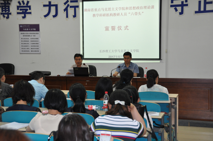5月16日下午,马克思主义学院在文科楼C-202组织师德师风教育暨湖南省重点马克思主义学院和重点思想政治理论课教学科研机构教研人员“六带头”宣誓仪式。院党委书记毛光华,院长陈万球,副院长张明海、李雨燕以及全体教师参加了本次教育活动和宣誓仪式。教育活动和宣誓仪式由毛光华主持。