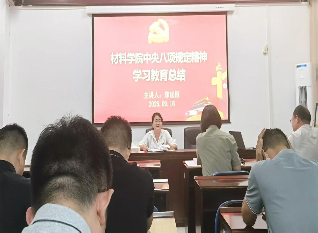 9月16日下午,材料科学与工程学院在新能源1-908召开深入贯彻中央八项规定精神学习教育总结大会,全体院领导出席,全体教职工参加。会议由学院党委书记郑延恒主持。