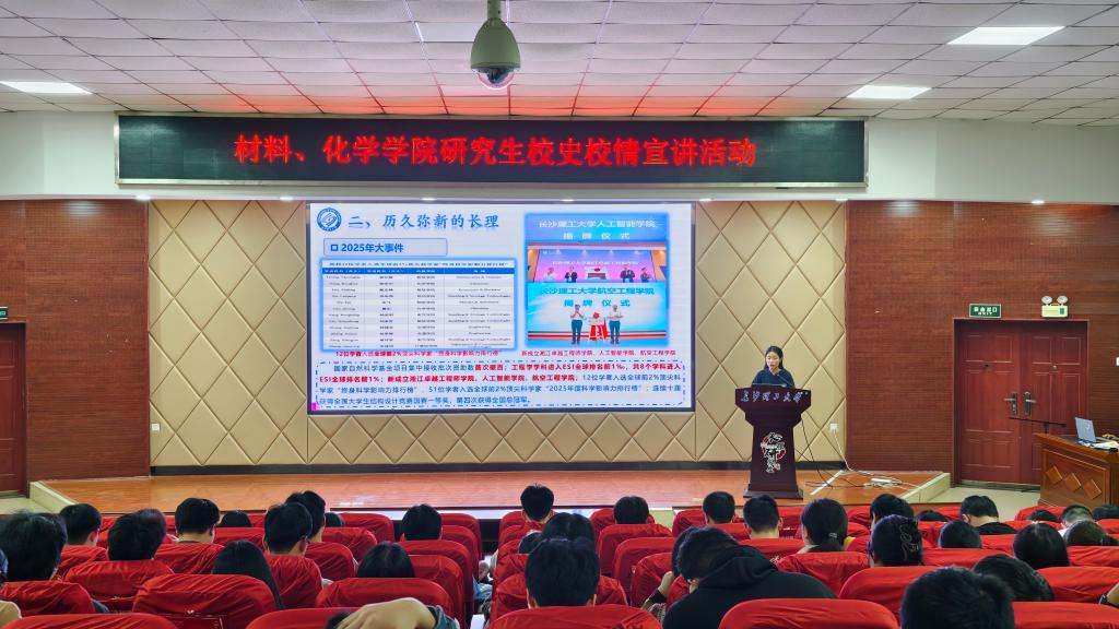 10月29日19:00,材料科学与工程学院联合化学与医药工程学院于文科楼A200报告厅举办校史校情宣讲会,面向学院2025级研究生新生介绍长沙理工大学发展历程,并开展互动。
