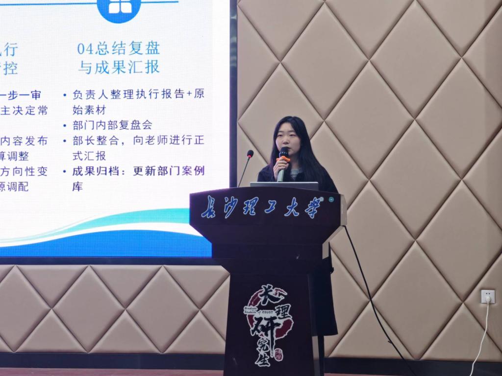 随后,土木学院郑珍结合自身工作履历,分享了团学组织建设与队伍管理的经验。她先介绍了所在学院团学会的职能划分与协作机制,继而深入剖析了不同岗位的核心素养要求。她指出,主席团成员需锤炼执行力、组织力、引领力、服务力,当好团学会统筹谋划的 “大脑中枢”;学生干事则要树牢政治意识、责任意识、担当意识、奉献意识、模范意识,筑牢团学工作的 “坚实根基”。此外,郑珍还谈及,团学工作带来的最大收获是实现了个人价值的 “获得感”,她寄语在场成员,要在岗位历练中找准定位、实现成长,收获专属的责任与荣光。