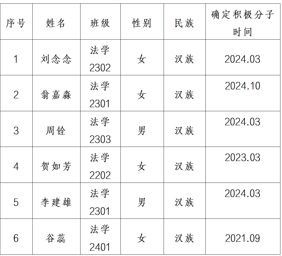 经征求党员群众和培养联系人意见后,法学院本科生党支部、法学院研究生党支部于2025年10月20日分别召开了支部委员会,经各支部讨论决定,确定贺如芳等6名同志为法学院分党校第23期发展对象。为发扬民主,广泛听取党内外群众意见,接受广大党员群众监督,现将贺如芳等6名同志的情况予以公示,公示期限为5个工作日(2025年10月20日—2025年10月24日)。如有异议,可在公示期内向本支部书记反映。