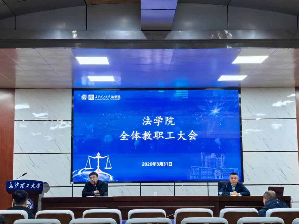 3月31日下午,法学院在金盆岭校区四号教学楼1楼学术报告厅召开教职工大会。会议由院党委书记龚文斌主持,全院教职工参加会议。