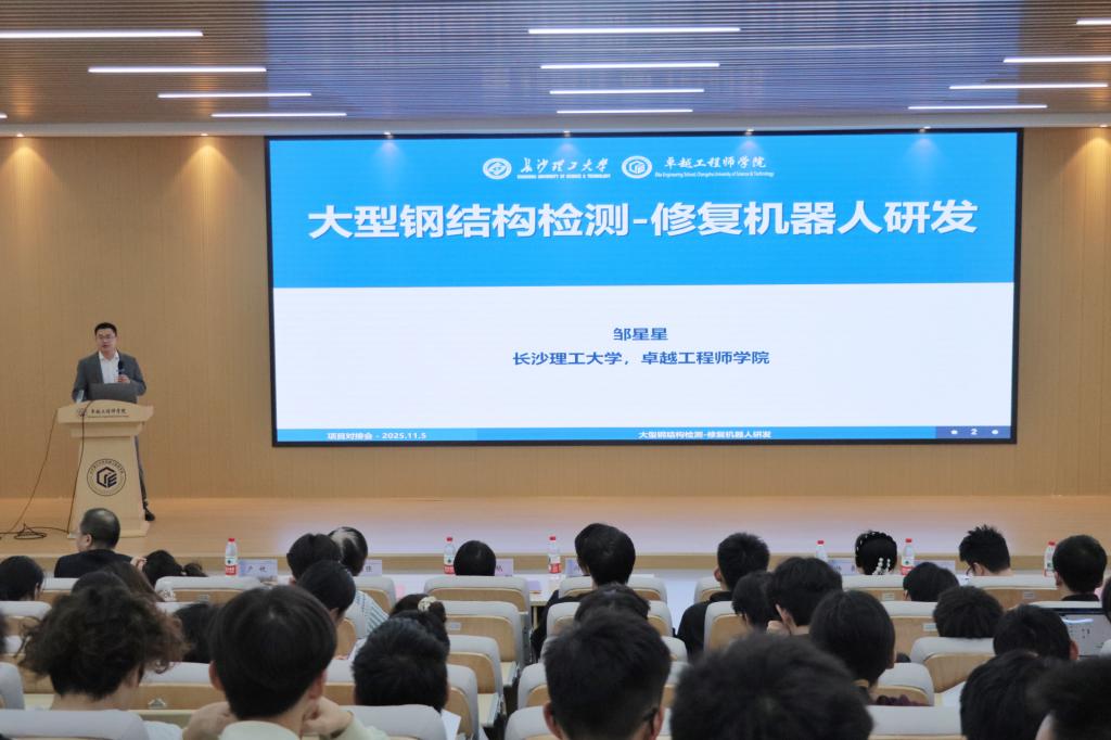 2025年11月5日下午,卓越工程师学院在新工训大楼515报告厅举办了“卓越创新创业能力提升计划——师生共创项目对接会”。会议特邀全国万名优秀创新创业导师代表游勇、湖南云顶之翼科技有限公司总经理李竣西子、岳麓山国家大学科技园成果转化部部长卢佼担任指导嘉宾。学院院长韩艳、党委书记杨晨、副院长杨现锋、交叉创新研究中心教授刘志强等领导与教师代表共同出席。会议由交叉创新研究中心主任王力东主持。