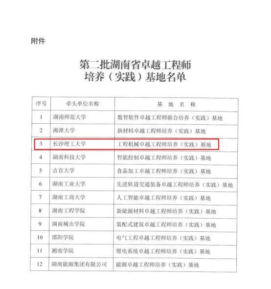 2025年10月9日,湖南省教育厅、湖南省工业和信息化厅公布了湖南省第二批卓越工程师培养(实践)基地立项名单,长沙理工大学卓越工程师学院牵头,联合湖南星邦智能装备股份有限公司、湖南五新隧道智能装备股份有限公司共同申报的“长沙理工大学工程机械卓越工程师培养(实践)基地”获批立项。基地将进一步完善“企业技术革新项目→毕业设计课题→工程实践成果”的转化机制,通过校内导师与企业导师共同全过程指导学生参与真实工程课题研究,与企业联合攻克一批关键技术,科技成果转化效益倍增,成为推动区域工程机械产业转型升级的技术创新策源地。