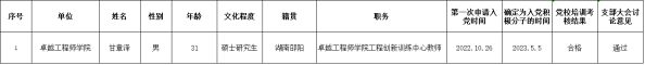经征求党员群众和培养联系人意见后,卓越工程师学院教工第二党支部2025年3月11日召开了支部委员会,经讨论决定,确定甘章泽为发展对象。为发扬民主,广泛听取党内外群众意见,接受广大党员群众监督,现将甘章泽同志的情况予以公示。