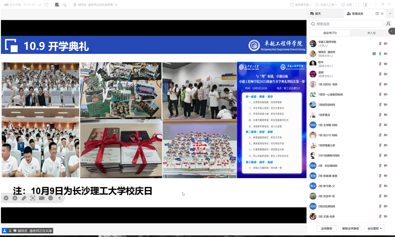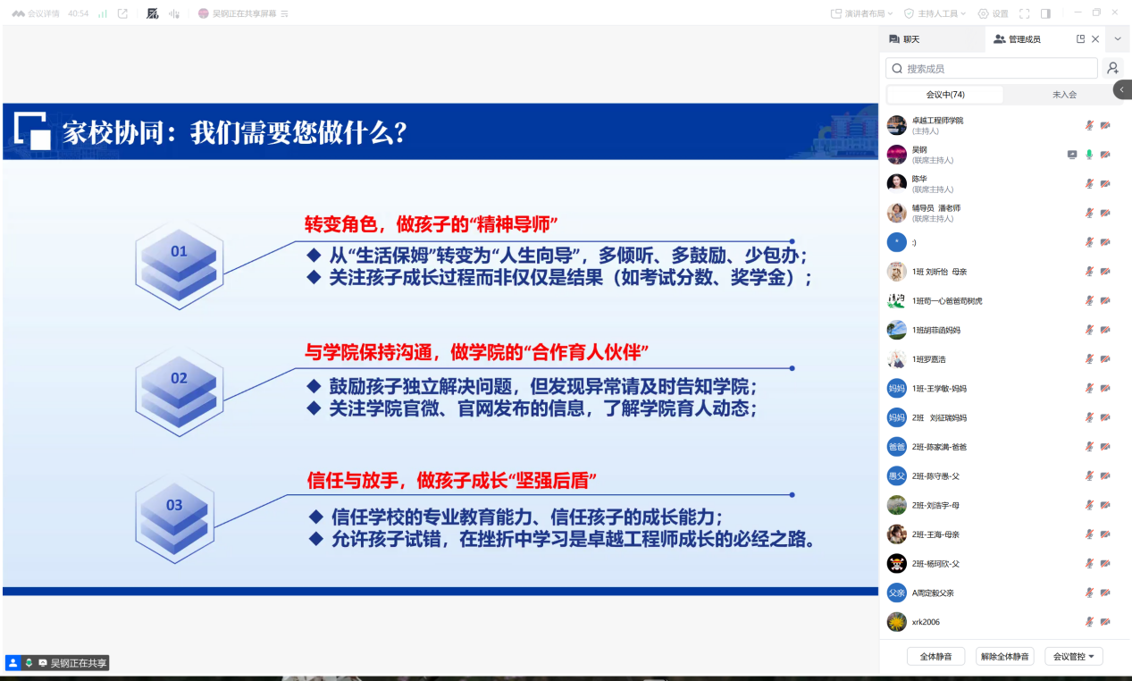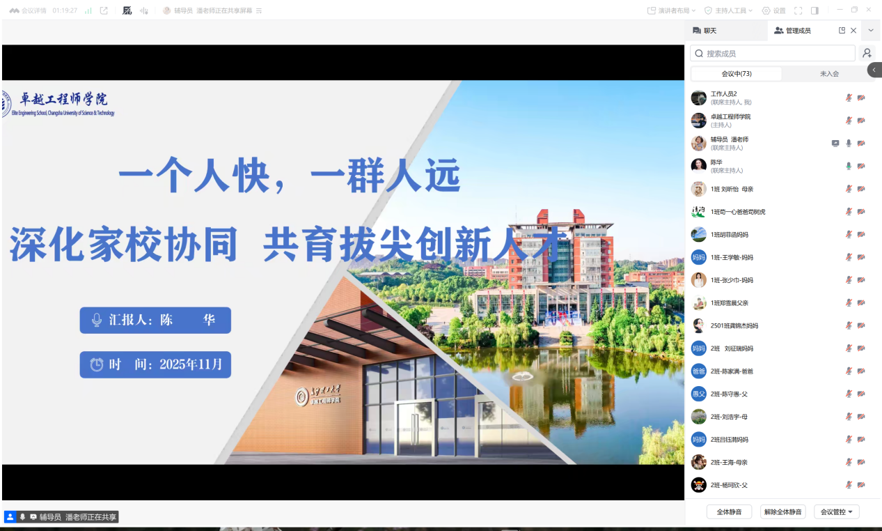 11月1日下午,卓越工程师学院通过腾讯会议平台召开2025级新生线上家长会,学院党委副书记陈华、副院长吴钢、新生班主任出席,新生辅导员潘枝花主持,25级全体新生家长参加。
