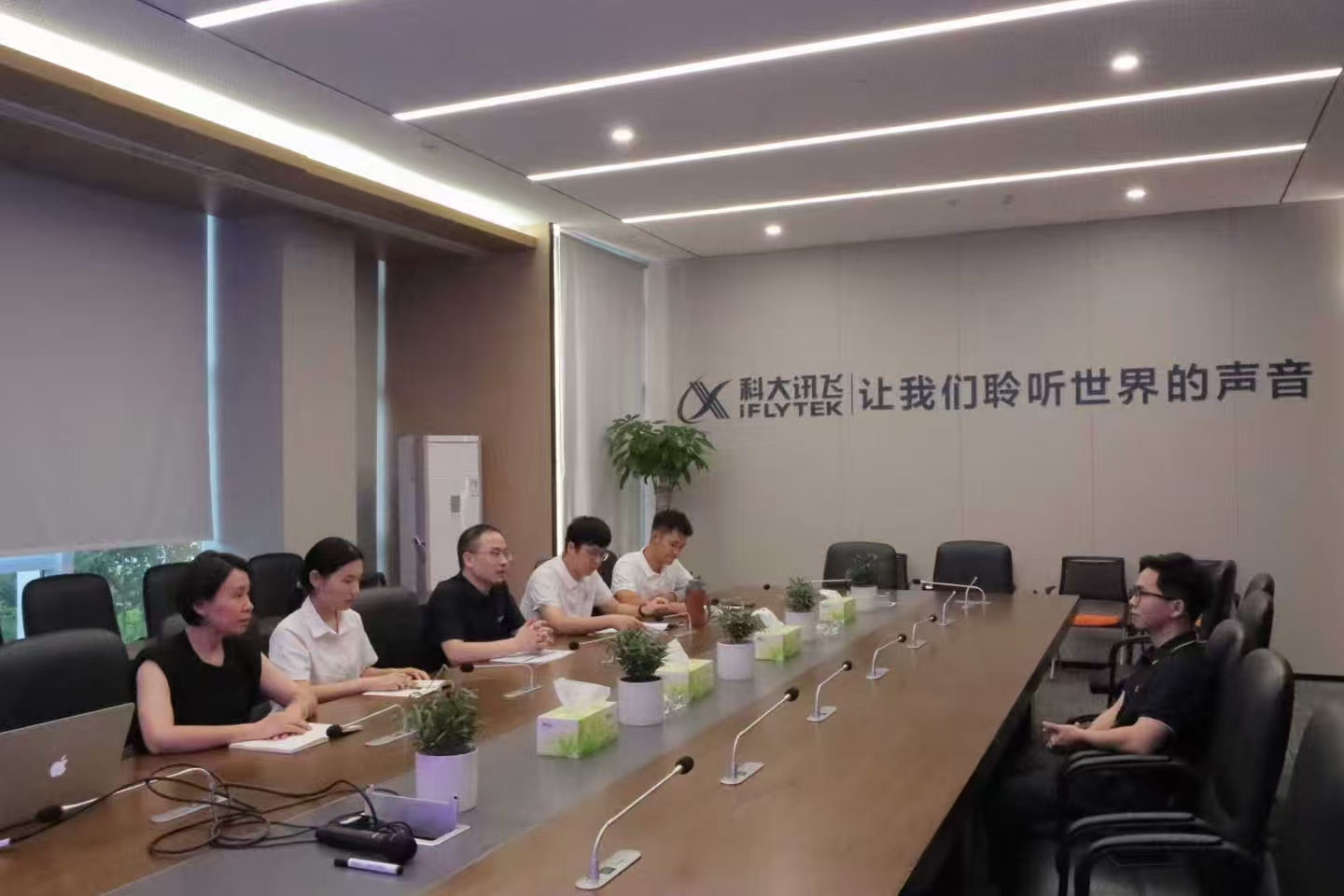 在科大讯飞中南总部展厅,学院领导一行深入了解了公司的发展历程、核心技术、应用场景以及未来蓝图,体验了公司在语音识别、机器翻译、自然语言处理和大模型等领域的最新技术成果。展厅参观让学院代表对科大讯飞的人工智能技术在实际场景中的应用有了更直观的认识,为后续合作找到了更多结合点。