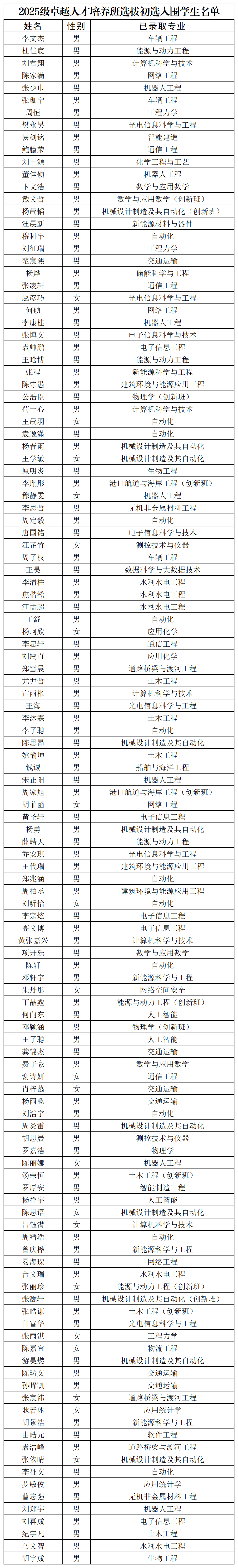 根据《关于做好长沙理工大学2025级“卓越人才培养班”学生选拔工作的通知》精神要求,学校教务处、卓越工程师学院组织相关专家成立了拔尖创新班选拔专家小组,对2025级卓越班相关申请人员所提交的材料进行了审核和汇总,确定了初选入围学生名单。现将入围进入下一轮面试和项目能力测试环节的学生名单进行公示,名单详见图片。