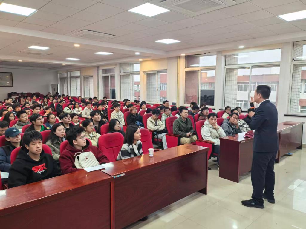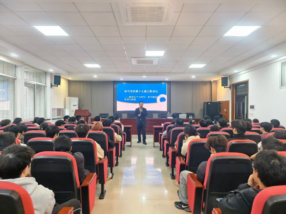 12月4日下午,我校电气与信息工程学院第十七届云影讲坛顺利开展。本次活动聚焦“新质生产力时代:电气就业的机遇与挑战”主题,特邀学院2007级校友、现任国网山东超高压公司党委党建部主任、工会副主席付兴担任主讲嘉宾。报告厅内座无虚席,百余名电气学子有序落座,对职业发展的期待溢于言表,现场氛围热烈而专注。