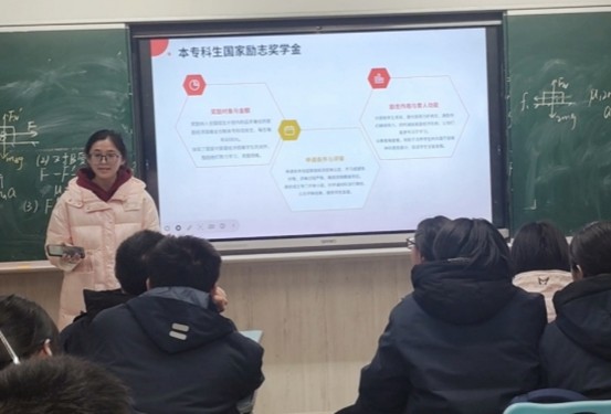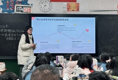 活动中,学生利用寒假返乡的机会,前往临湘、郴州、邵阳等地的高中母校,化身资助政策宣讲员开展宣讲。他们精心制作宣传PPT,结合自身成长经历现身说法,生动讲述在国家资助与学校帮扶下安心求学、励志成长的故事。同时,宣讲队员通过发放宣传资料,细致解读国家助学金、国家助学贷款等各类资助项目的申请条件、办理流程及发放标准,并现场为学弟学妹及家长答疑解惑。