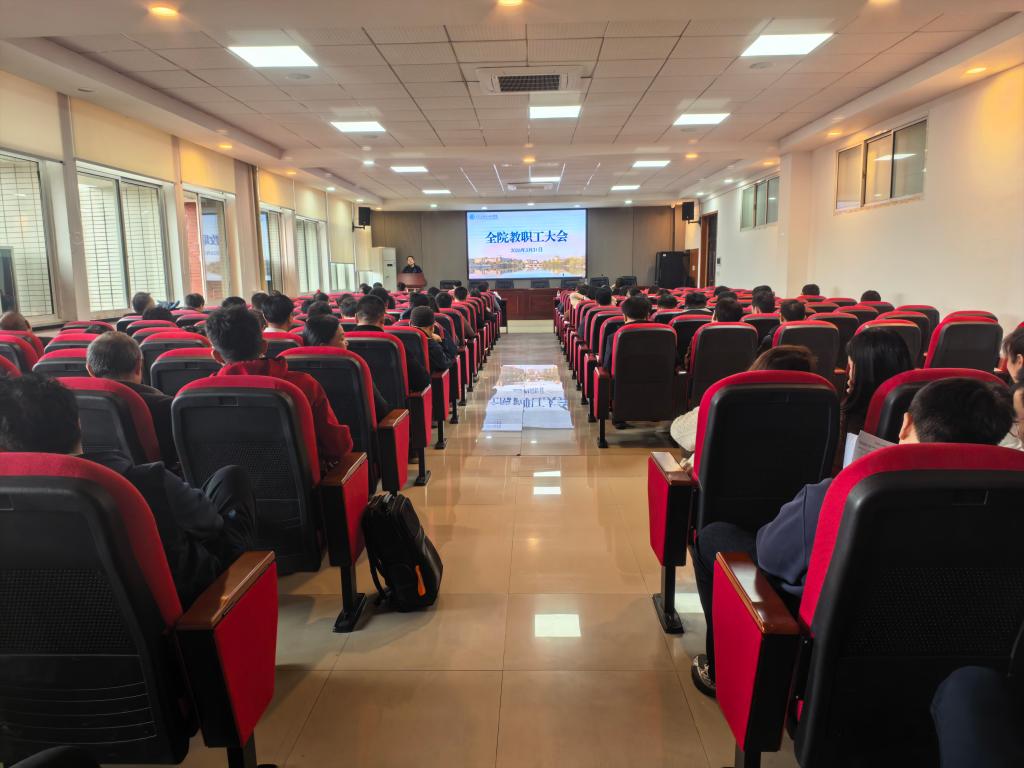 3月31日下午,学院在工一B503报告厅召开全院教职工大会,部署新学期工作。院党委书记丁丹主持会议并讲话,副院长(主持工作)邓丰作工作部署,全体院领导及教职工参加会议。