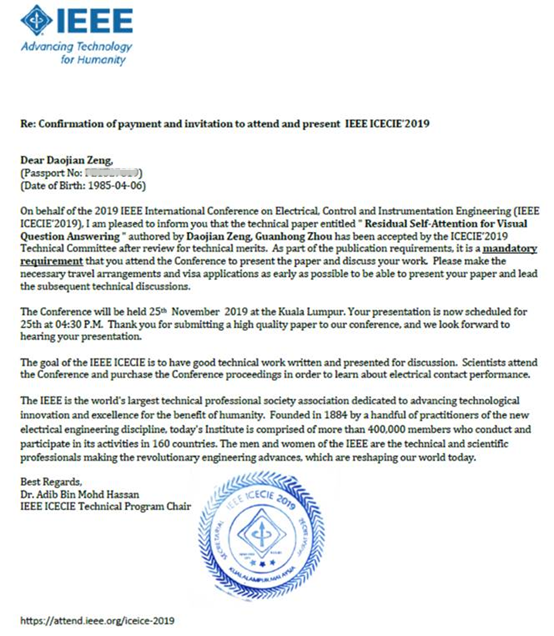 谨代表2019年IEEE国际电气,控制和仪器仪表工程会议(IEEE ICECIE'2019),谨通知您,曾道建,周冠宏撰写的技术论文《视觉答问的剩余自我注意》经过审查的技术优点已被ICECIE'2019技术委员会接受。作为出版要求的一部分,您必须参加会议才能提交论文并讨论您的工作,这是一项强制性要求。请尽早做出必要的旅行安排和签证申请,以便能够展示您的论文并主持后续的技术讨论。