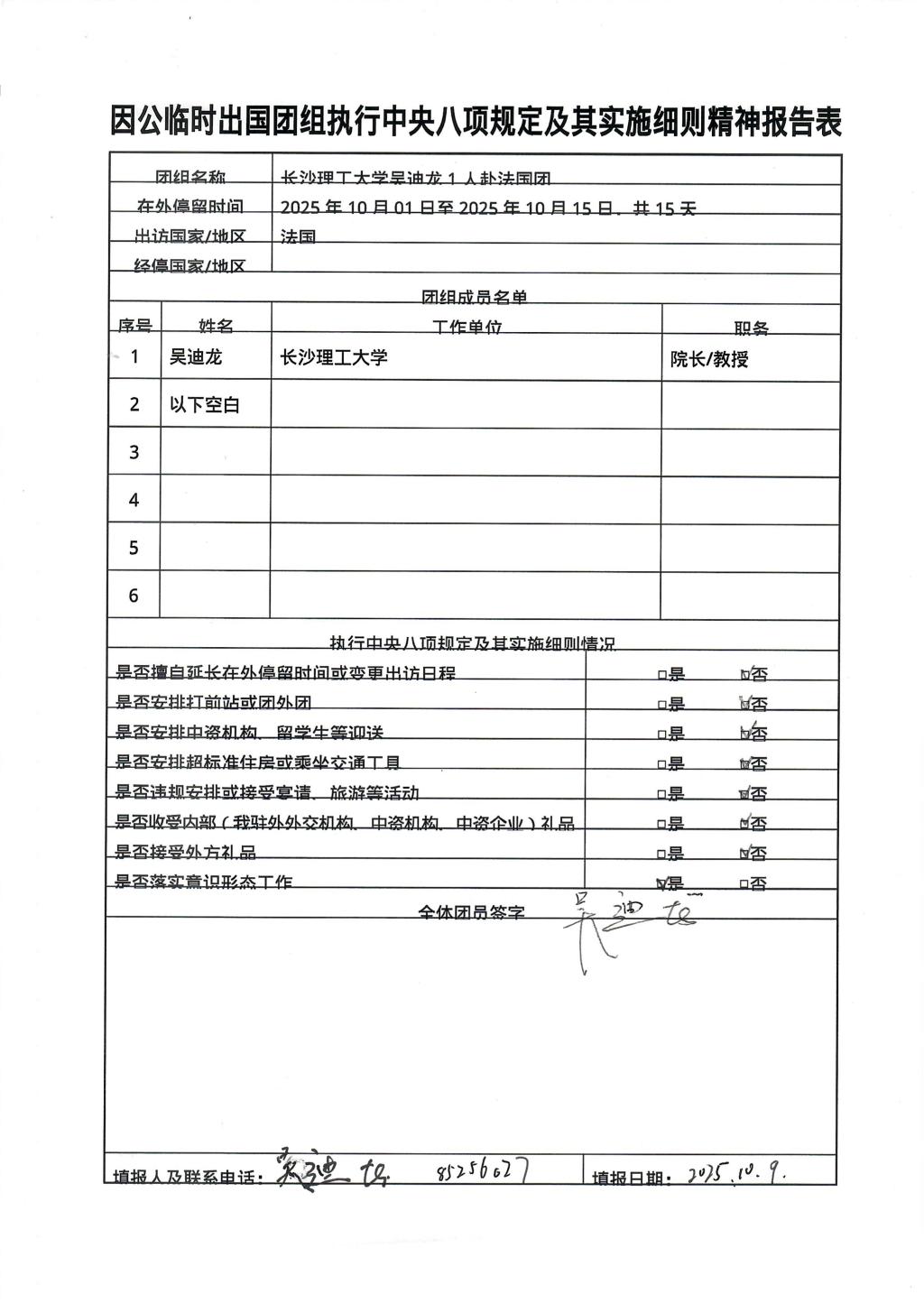 《因公临时出国团组执行中央八项规定及其实施细则精神报告表》