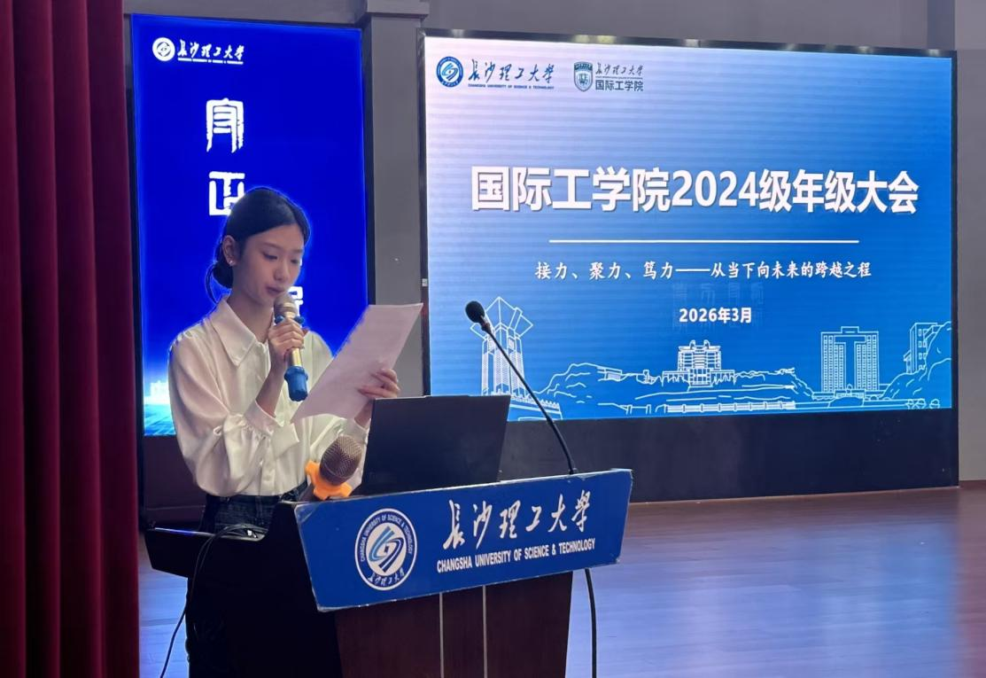 为扎实推进学风建设,明晰年级管理要求,规划学期发展方向,2026年3月,长沙理工大学国际工学院2024级“接力、聚力、笃力——从当下向未来的跨越之程”主题年级大会在学生活动中心科技报告厅顺利举行。国际工学院2024级辅导员易芙蓉、2024级全体学生参与本次大会。