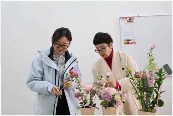 活动现场,提前备好的玫瑰、康乃馨、小雏菊、香雪兰、风铃花、紫罗兰等各色鲜花,连同花器、剪刀、花泥等工具整齐摆放,沁人心脾的花香弥漫其间,现场暖意融融、氛围浓厚。老师们有序领取花材,怀着对美好事物的热爱,缓缓开启了自主插花创作之旅。