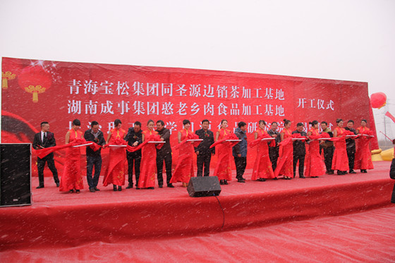 10月28日上午,长沙理工大学食品研究所揭牌仪式与同青海宝松集团同圣源边销茶和湖南成事集团憨老乡肉食品加工基地开工仪式在青海省海北州生物产业园隆重举行。青海省海北州门源县县长黄继成,副县长汪璟邦,发展和改革局局长沙登清,我校产学研办公室副主任陈炜,化学与生物工程学院院长助理王建辉,出席了此次揭牌仪式。
