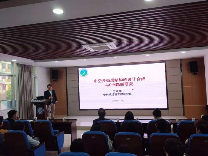 2025年11月27日下午,应长沙理工大学化学与医药工程学院邀请,中国科学院过程工程研究所万家炜研究员莅临我校开展学术交流,在新能源大楼3B-310报告厅作了题为"中空多壳层结构的设计合成与C-N偶联研究"的学术报告。报告由学院副院长陈启杰教授主持,学院师生共90余人参加了此次学术报告。