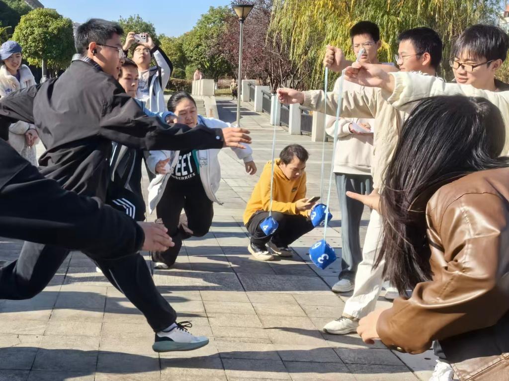 活动由幸福舍曹子妍主持,各参赛队伍围绕“跳绳接力”“不倒森林”“动力火车”“眼疾手快”“emoji猜猜猜”五项趣味项目依次展开,各参赛队伍积极参与。整场活动节奏紧凑、秩序井然,其中“emoji猜猜猜”将现场氛围点燃至沸点!全体参赛成员并肩而立,目光灼灼地锁定目标,随着裁判的一声令下,所有人如离弦之箭般迅猛冲刺,脚步踏得地面微微作响。率先抢到沙包的幸运儿一手将战利品高高举过头顶,脸上漾开藏不住的狂喜。现场的加油声、交流声、笑声交织成热络的乐章,每一声都裹着快乐,将热闹鲜活的氛围渲染得淋漓尽致。