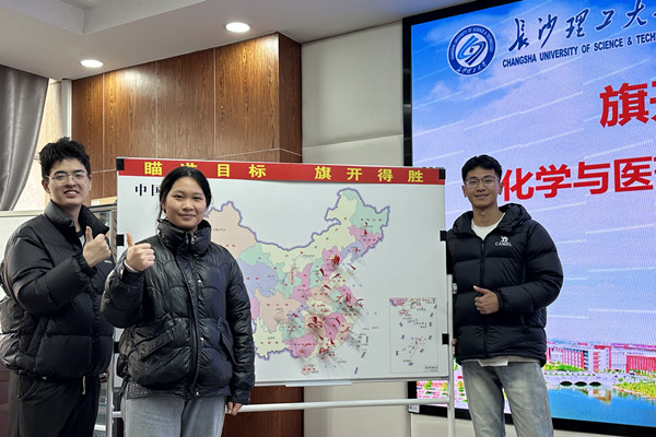 随后,活动进入了别具意义的“插旗明志”环节。会场一侧布置了一幅大型中国地图,考研学子们将写有自己名字的“心愿旗”,郑重地插在目标院校所在地的版图上。一面面旗子不仅象征着学子们清晰的奋斗目标,更汇聚成一股昂扬向上的蓬勃力量,展现了化院学子志在四方、勇攀高峰的决心与风采。