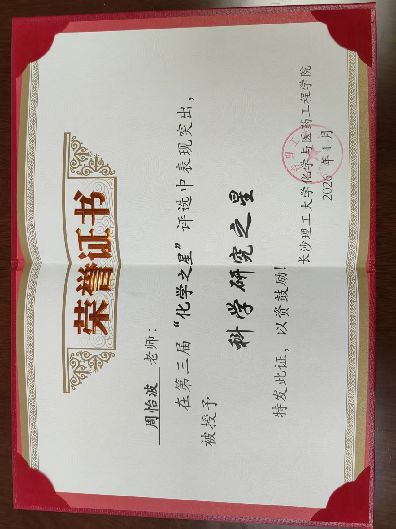 获奖等级:湖南省化学化工学会第十八届青年化学化工奖