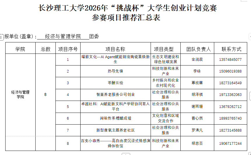 经过各项目自主申报,学院审核,拟推荐以下8个项目,参加长沙理工大学2026“挑战杯”大学生创业计划竞赛,具体名单如下,公示期为:2026年3月19日-3月23日,公示期间如有问题,请实名反馈至学院团委何老师:0731-85222309.