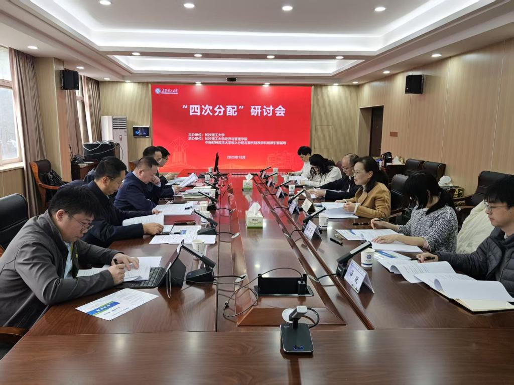 2025年12月29日至30日,由中南财经政法大学收入分配与现代财政学科创新引智基地、长沙理工大学共同富裕研究院主办的“四次分配”学术研讨会,在长沙理工大学经管大楼F202会议室成功举办。本次会议以圆桌形式展开,围绕“第四次分配”的理论构建、历史脉络、现实意义及政策启示展开深入探讨,旨在推动构建具有中国特色的收入分配理论自主知识体系。