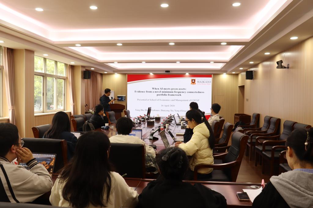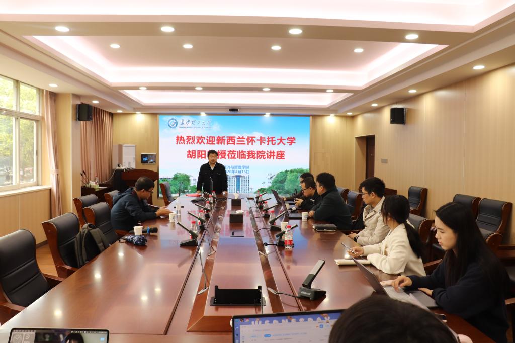 2026年4月15日上午,新西兰怀卡托大学胡阳教授应邀在经管大楼F202室主讲金岭学术大讲堂第88期(2026年第4期),主题为“When AI meets green assets:Evidence from a novel minimum frequency connectedness portfolio framework”。讲座由经管学院杨鑫副教授主持,40余名学院青年教师和硕、博士研究生参加了本次讲座。