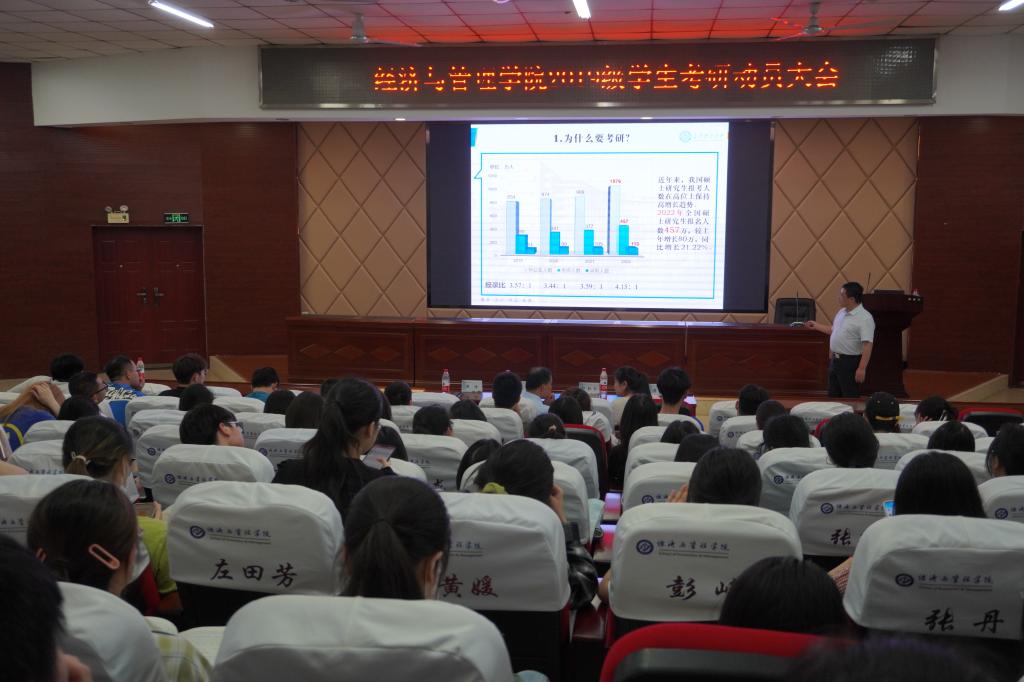 2022年6月14日晚,经济与管理学院在文科楼A200召开了2019级学生考研动员大会。本次会议邀请了研究生院副院长龙科军、学院副院长王治作主讲,学院副院长彭新宇、2019级考研同学参加,学院党委副书记唐青主持。